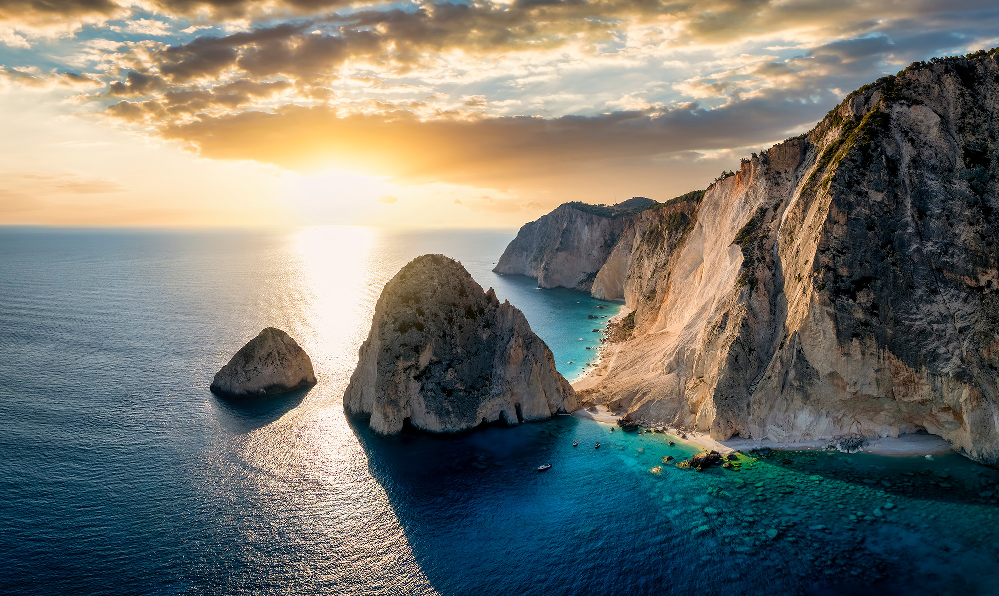 Wybierz się w idylliczny, relaksujący rejs po Morzu Jońskim, u wybrzeży wspaniałej wyspy Zakynthos. Pozwól się oszołomić lazurowym odcieniom morskiej wody w Zatoce Laganas, kto wie, może uda Ci się dostrzec żółwie Caretta-caretta, dumę i oczko w głowie mieszkańców wyspy. Wypatruj uważnie, czy na urokliwej wyspie Cameo nie odbywa się akurat jakiś ślub. Opłyniemy także wyspę Marathonisi, wspaniałe klify i jaskinie przylądka Keri, aż dopłyniemy do skał Mizithres. To właśnie tam, z kieliszkiem greckiego wina w dłoni, pożegnasz topiące się w morskich falach słońce i zachwycisz tym niezapomnianym, poruszającym serce widokiem.